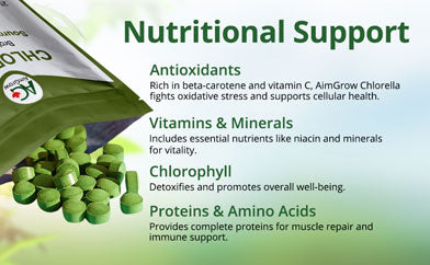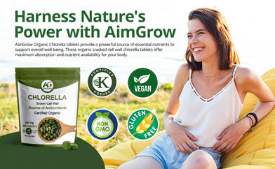 - Nutrient-Rich Superfood - AimGrow Organic Chlorella is a powerhouse of essential vitamins, minerals, and amino acids. The broken cell wall of our chlorella tablets enhances nutrient absorption, ensuring that your body fully benefits from its comprehensive nutritional support.