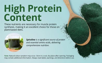 - Enhances Protein Intake - With its high protein content, this superfood is a complete protein source containing all essential amino acids. Spirulina protein powder is ideal for vegetarians, vegans, and individuals looking to boost their protein intake naturally.
